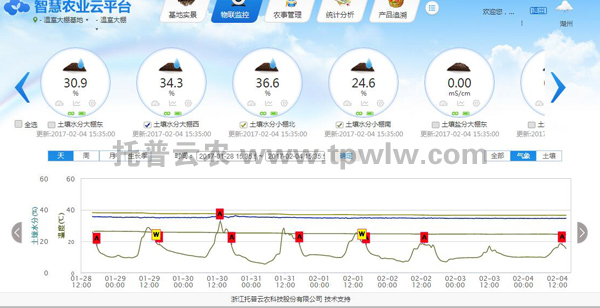 浙江托普云農(nóng)水肥一體化監(jiān)控系統(tǒng)能夠?qū)崟r監(jiān)測基地大蔥的種植環(huán)境,實現(xiàn)智能化、定時定量的灌溉,其中包括系統(tǒng)云平臺、視頻監(jiān)控系統(tǒng)、采集終端、施肥機、過濾系統(tǒng)、閥門控制器、電磁閥、田間管路等。系統(tǒng)所采集的數(shù)據(jù)實時上傳到托普智慧農(nóng)業(yè)云平臺,并快速進行統(tǒng)計分析,解決了工作人員對數(shù)據(jù)的采集分析需求,并確保了數(shù)據(jù)采集的精準、快速、全面。用戶可通過手機APP和電腦端遠程實時查看基地現(xiàn)場視頻、水肥流量統(tǒng)計數(shù)據(jù),也可遠程手動設(shè)置水肥參數(shù),很大程度上提高了灌溉用水效率。