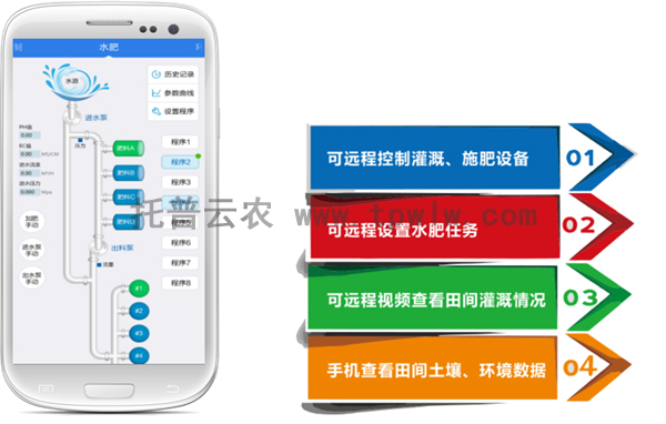 大蔥定植后,肥水管理是高產(chǎn)、優(yōu)質(zhì)的重要環(huán)節(jié)。托普云農(nóng)水肥一體化自動控制系統(tǒng)可根據(jù)監(jiān)測的土壤水分、作物種類的需肥規(guī)律,設(shè)置周期性水肥計劃實施輪灌。用戶可通過施肥機設(shè)置灌溉量、肥液濃度、酸堿度等水肥過程的重要參數(shù),也可通過電腦或手機APP遠程設(shè)置相應(yīng)參數(shù)進行灌溉施肥,從而實現(xiàn)對灌溉、施肥的定時、定量控制,充分提高水肥利用率。