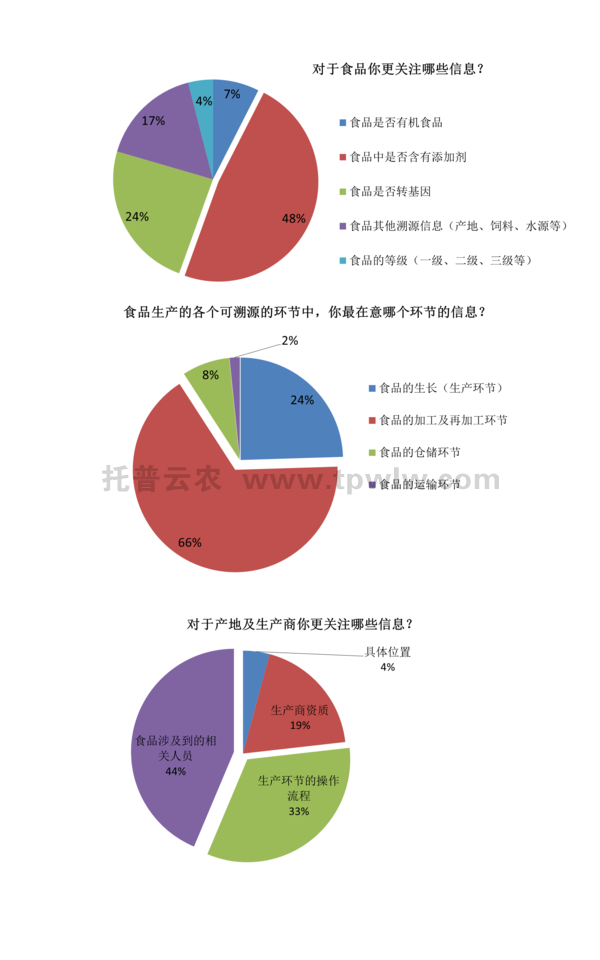 除此之外,也有不少人表示對食物生長信息比較在意。食品中是否含有添加劑、是否轉(zhuǎn)基因等信息也是人們關(guān)注的重點。對于食品生產(chǎn)地和生產(chǎn)商,人們更關(guān)注生產(chǎn)(生長)環(huán)節(jié)的操作流程和食品涉及到的相關(guān)人員的信息。