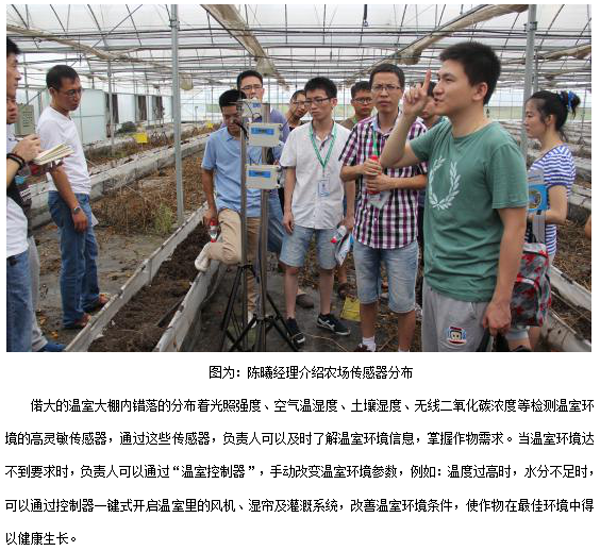 喬司農(nóng)場是浙江省首家集規(guī)模種植、科研生產(chǎn)、網(wǎng)絡銷售、宅配服務為一體的國家級農(nóng)業(yè)綜合開發(fā)綠色蔬菜生產(chǎn)基地。2014年4月中旬,托普物聯(lián)網(wǎng)系統(tǒng)在喬司農(nóng)場成功搭建運行。 隨后的8月2日,銷售部全體員工在時任營銷經(jīng)理陳曦的帶領下前往喬司農(nóng)場,觀看農(nóng)場內(nèi)的物聯(lián)網(wǎng)系統(tǒng)運行情況。
