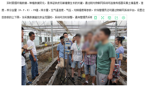 在《陽光物聯(lián)網(wǎng)引領仙草(鐵皮石斛)種植新方式》一文中,不僅“學習”物聯(lián)網(wǎng)系統(tǒng)的建設原理,以及操作方式外,還引用當時參觀時拍攝的圖片。為了降低圖片的辨識度,還對圖片進行模糊處理。
