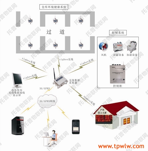 為此,浙江托普云農(nóng)科技股份有限公司潛心研發(fā)了“農(nóng)產(chǎn)品窖藏監(jiān)測預(yù)警管理系統(tǒng)”,實現(xiàn)對倉庫環(huán)境實時監(jiān)測,即時預(yù)警,并能夠自動控制通風(fēng)、加溫設(shè)備,確保倉儲安全,并對監(jiān)測數(shù)據(jù)進(jìn)行科學(xué)分析,進(jìn)而智能匹配農(nóng)產(chǎn)品貯藏的最佳環(huán)境條件,有效預(yù)防和減輕馬鈴薯腐爛,確保安全過冬減少損失,同時避開上市銷售高峰時期,實現(xiàn)反季節(jié)銷售,大幅提高銷售價格,增加農(nóng)民收入。2、系統(tǒng)架構(gòu)