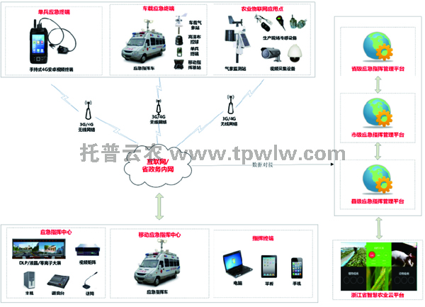 農(nóng)業(yè)應(yīng)急指揮解決方案是托普為加強全省突發(fā)事件處置能力和管理水平,根據(jù)農(nóng)業(yè)部《農(nóng)業(yè)應(yīng)急管理信息化建設(shè)總體規(guī)劃(2014-2017年)》建設(shè)要求,按照《全省農(nóng)業(yè)應(yīng)急指揮系統(tǒng)建設(shè)方案》文件精神,浙江托普緊密依托“浙江省智慧農(nóng)業(yè)云平臺”和“浙江省視頻會議系統(tǒng)”,建設(shè)農(nóng)業(yè)應(yīng)急綜合指揮系統(tǒng),實現(xiàn)各地區(qū)農(nóng)業(yè)生產(chǎn)環(huán)境管理和農(nóng)業(yè)災(zāi)病的遠程管控、動態(tài)監(jiān)測、專家會商、災(zāi)變預(yù)警和緊急指揮調(diào)度,滿足省市縣三級聯(lián)動應(yīng)急管理要求,提高農(nóng)業(yè)應(yīng)急指揮和災(zāi)變預(yù)警水平。